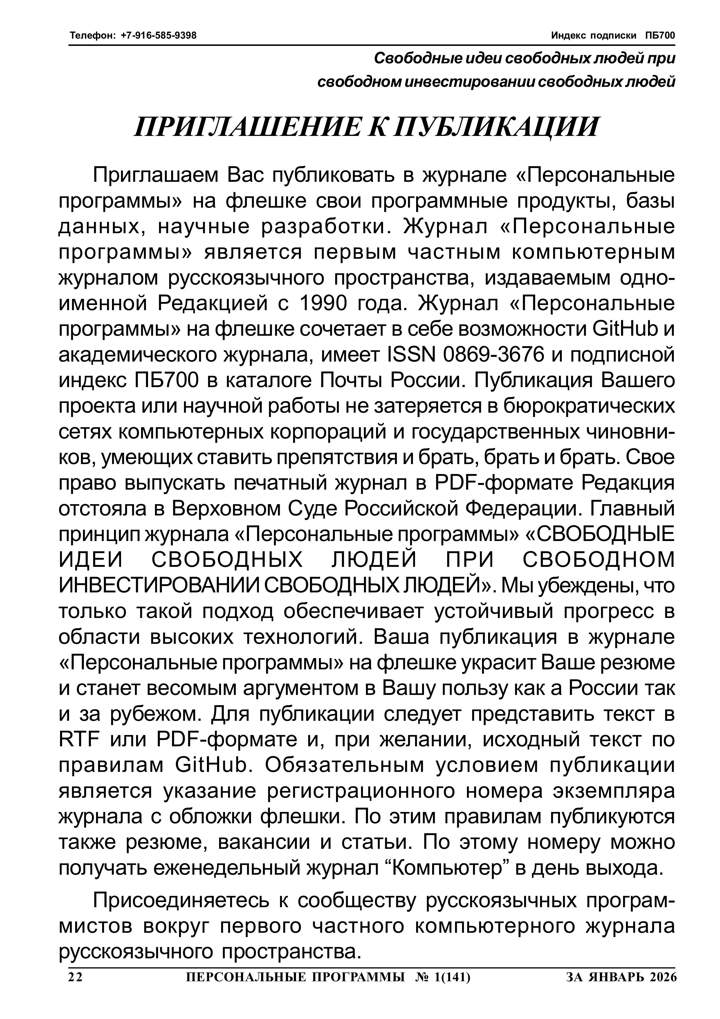 Журнал "Персональные программы" на флешке 2026 год, N 1, стр.022 ПРИГЛАШЕНИЕ К ПУБЛИКАЦИИ Обязательным условием публикации является указание регистрационного номера экземпляра журнала с обложки флешки. По этим правилам публикуются также резюме, вакансии и статьи. По этому номеру можно получать еженедельный журнал “Компьютер” в день выхода.
