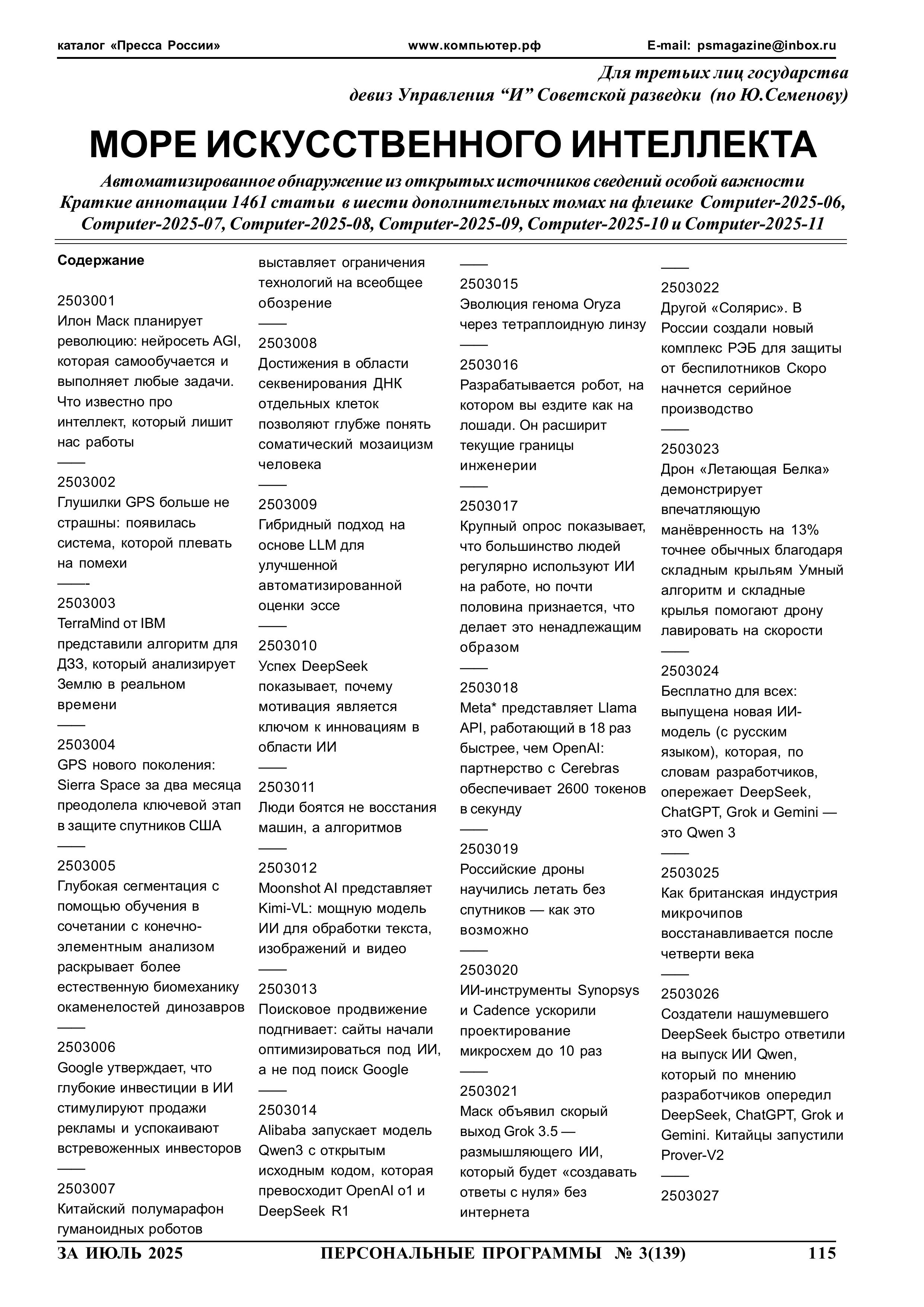 МОРЕ ИСКУССТВЕННОГО ИНТЕЛЛЕКТА Автоматизированное обнаружение из открытых источников сведений особой важности Краткие аннотации 1461 статьи в шести дополнительных томах на флешке Computer-2025-06, Computer-2025-07, Computer-2025-08, Computer-2025-09, Computer-2025-10 и Computer-2025-11 2025 год N 3 стр.115