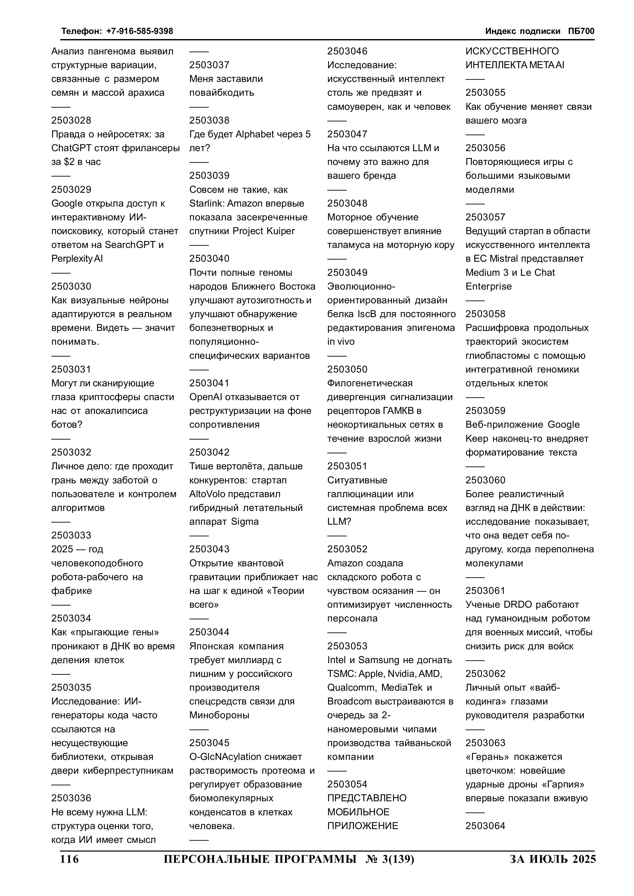 МОРЕ ИСКУССТВЕННОГО ИНТЕЛЛЕКТА Автоматизированное обнаружение из открытых источников сведений особой важности Краткие аннотации 1461 статьи в шести дополнительных томах на флешке Computer-2025-06, Computer-2025-07, Computer-2025-08, Computer-2025-09, Computer-2025-10 и Computer-2025-11 2025 год N 3 стр.116