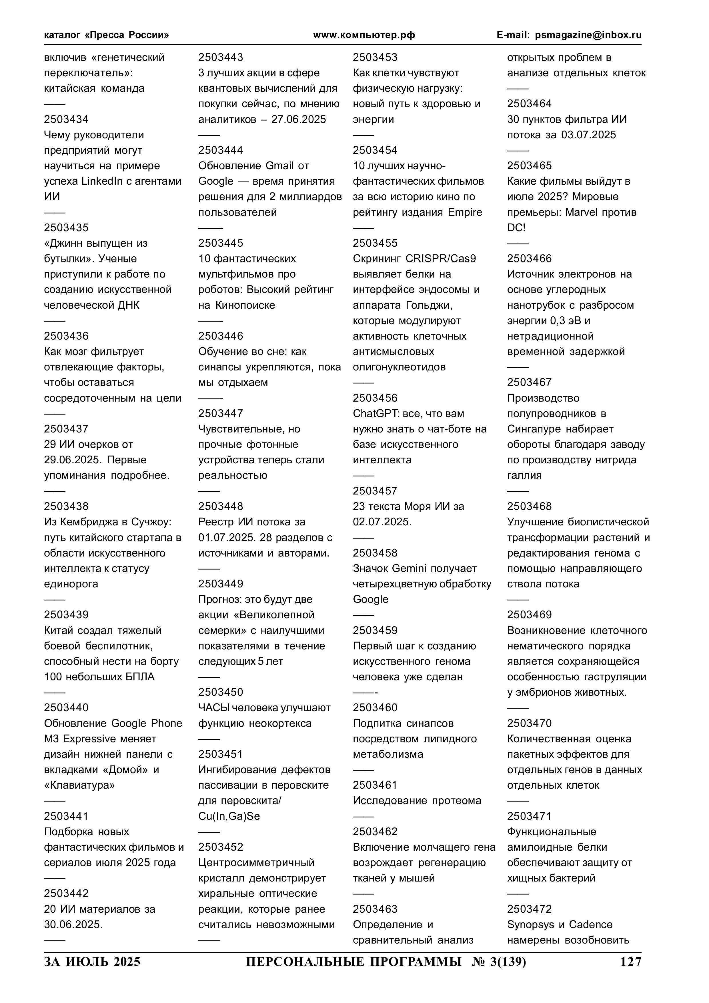 МОРЕ ИСКУССТВЕННОГО ИНТЕЛЛЕКТА Автоматизированное обнаружение из открытых источников сведений особой важности Краткие аннотации 1461 статьи в шести дополнительных томах на флешке Computer-2025-06, Computer-2025-07, Computer-2025-08, Computer-2025-09, Computer-2025-10 и Computer-2025-11 2025 год N 3 стр.127